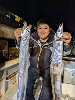 皆さん、おはようございます。昨夜も18時タチに出船しました。最近お邪魔している海域に行ったけど当たるのがシラガでまともなのがいませんでした。そこで何年ぶりかで遠走りしちゃいました。追加料金を余分にいただいて目いっぱい頑張ってきました。帰り際に右舷側の4名様グループに聞いたところ36匹、32匹、29匹、21匹でした。前夜は細いのが多かったけど、昨夜はまた様子が変わっていて大晦日?元旦?の終盤の感じで難しいけど当たれば型がそんなに悪くない感じでした。実際おかずにいただいたタチも悪くなかったです。今夜は今のところお客さんがないのでいただいたタチをフライとから揚げで食べてみようかと思っているところです。